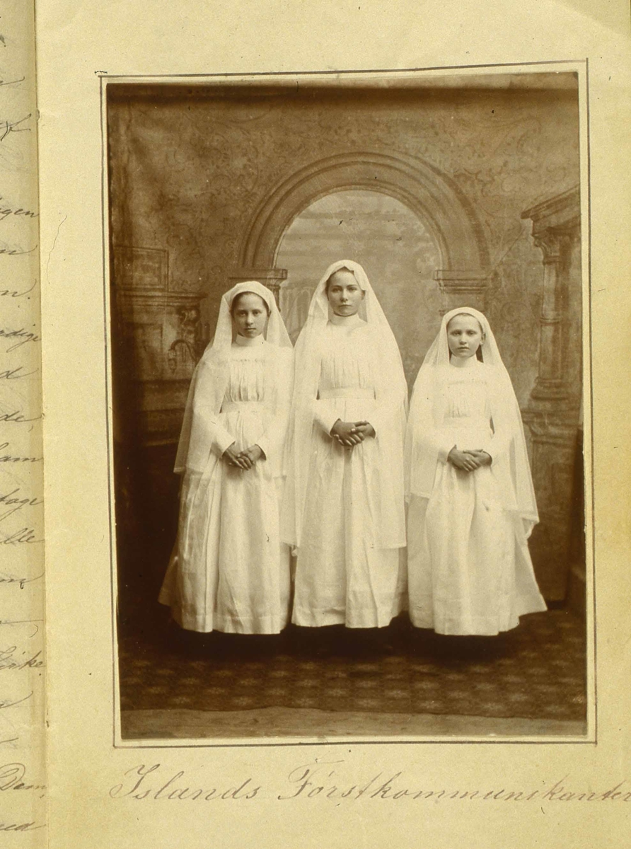 Þrjár stúlkur í hvítum fermingarkjólum með slör. Undir myndina er skrifað Islands Fórstkommunekanter.
