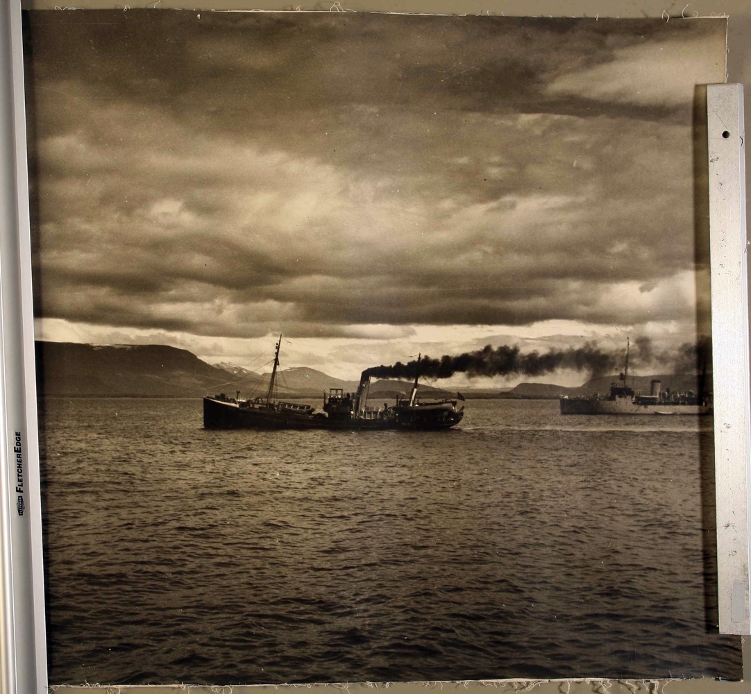 Togari á siglingu úr höfn, mikinn reyk leggur upp úr skorsteini. Annað stórt skip í bakgrunni.