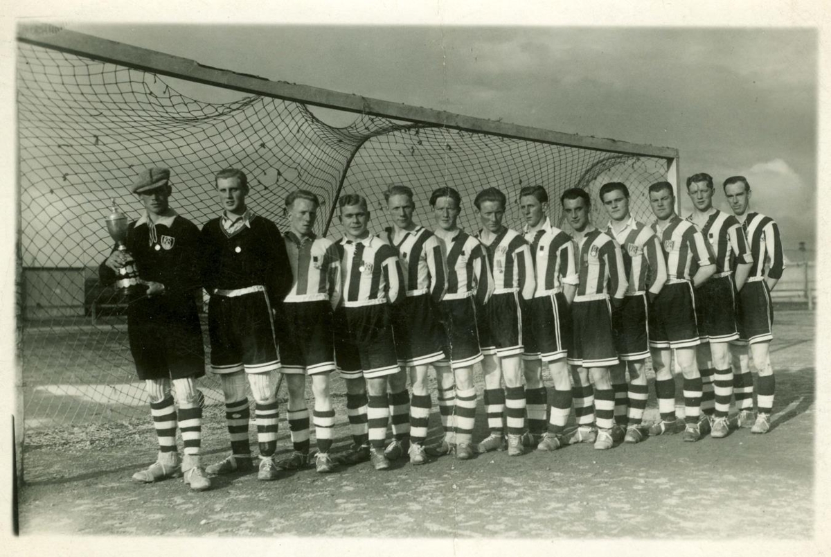 Melavöllur. Reykjavík. Fótboltalið karla í búningum merktum KR uppstillt í röð við mark. Fremsti maður heldur á bikar. Björgvin Schram lengst t.h.? Um 1940?