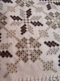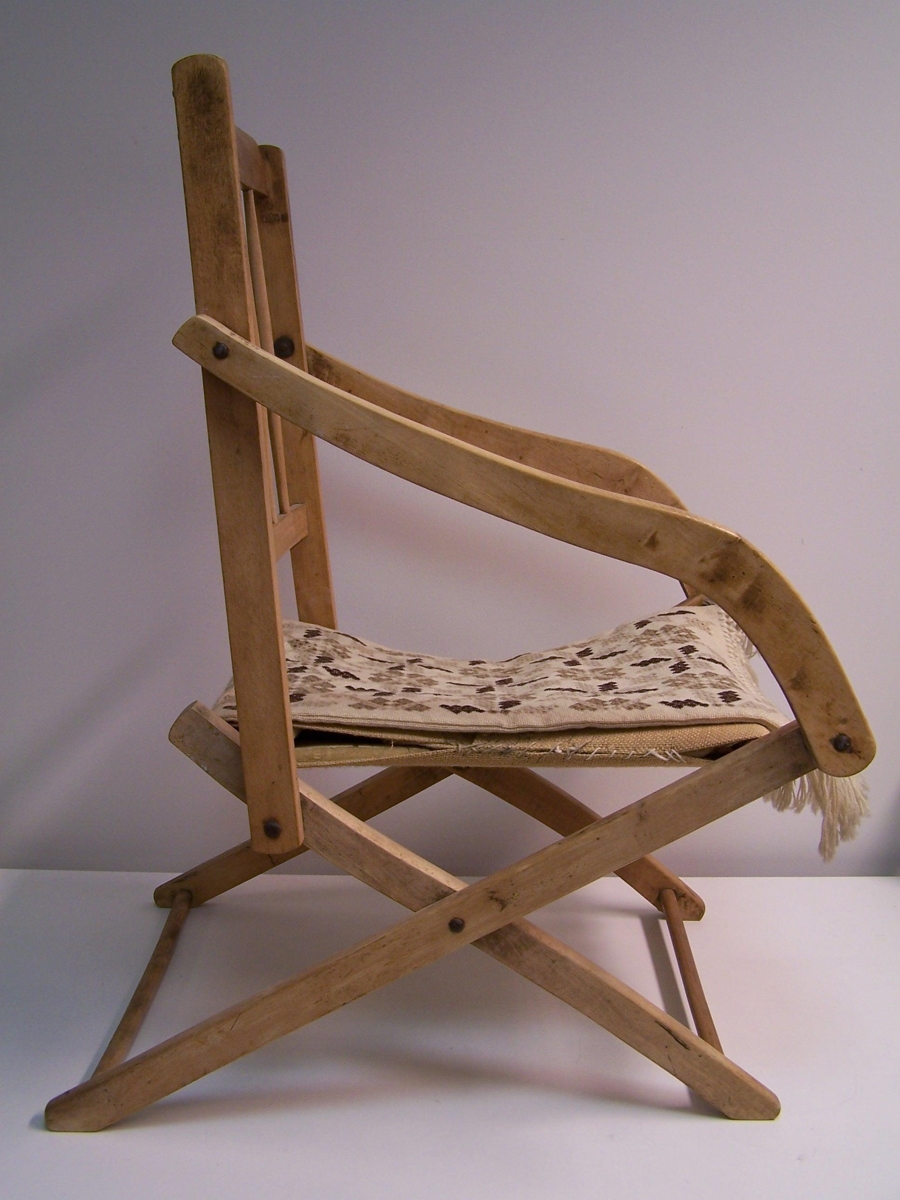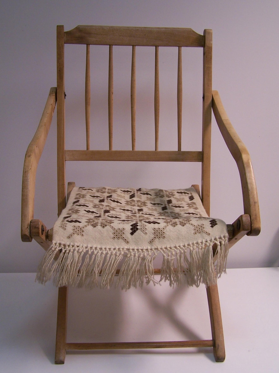 Samanbrjótanlegur stóll úr við, með útsaumaðri setu. Stólinn er frá Eyjardálsá í Bárðardal.