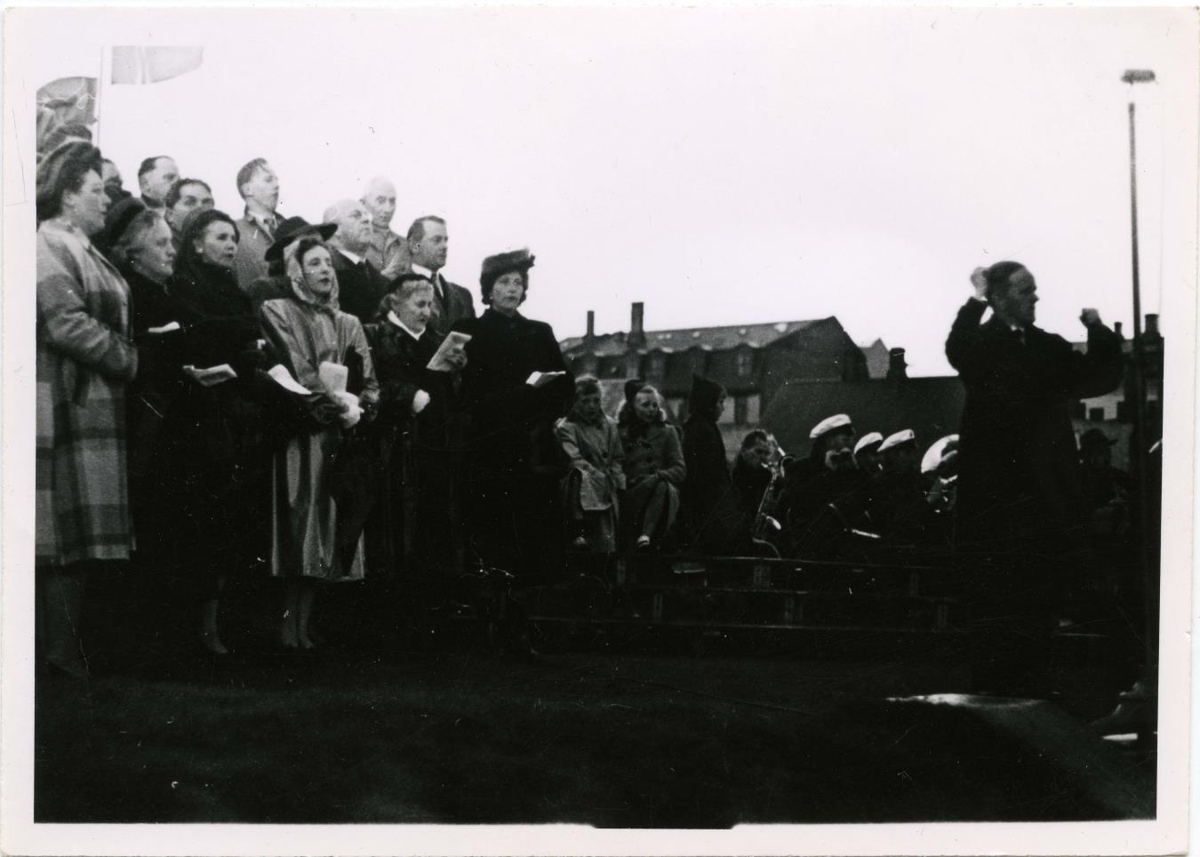 Arnarhóll. Blandaður kór syngur undir stjórn kórstjóra neðan við stöpul styttu. Victor Urbancic stjórnar. Fánar og veifur. 17. júní? Um 1950. Sex myndir.