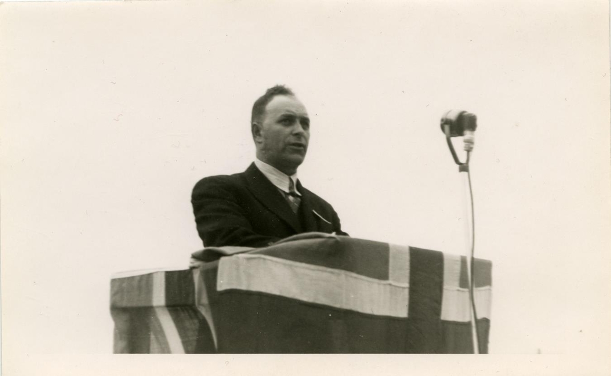 Melavöllur. Maður í ræðupúlti sveipuðu íslenska fánanum og með hátalara framan við. Henry Hálfdánarson. Sjómannadagurinn 1943. Sjá Alþýðublaðið 8. júní 1943.