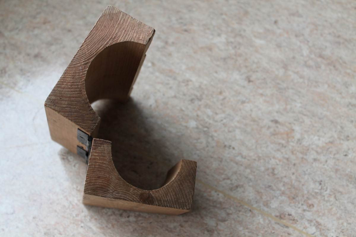 Um er að ræða annað af tveimur skapalónum (hitt er nr. A 9916) sem Þórður Jónsson smiður (Þórður blindi) gerði til að tálga snúninga á skáp sem hann gerði fyrir Ólínu systur sína (1891-1970). Á þessu eintaki eru hjarir úr málmi og hæðin er um 20 cm. Bjarni Vilmundarson (f. 1928) á Mófellssstöðum bróðursonur Þórðar gaf byggðasafninu skapalónin í mars 2014 og sagði þau eiga að fylgja skápnum sjálfum sem er í eigu safnsins.