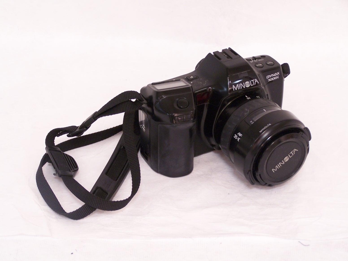 Teg. Minolta Dynax 7000 i Ljósmyndavél með áfastri AF 35-105 linsu. Svört. Mál: H. 9,5cm 15x13 cm. Hlutinn gerði Minolta.