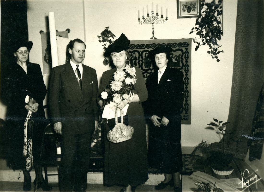 Reykjavíkursýningin 1949. Kona með blómvönd og yngri karlmaður við hlið hennar, bakvið eru tvær aðrar konur.