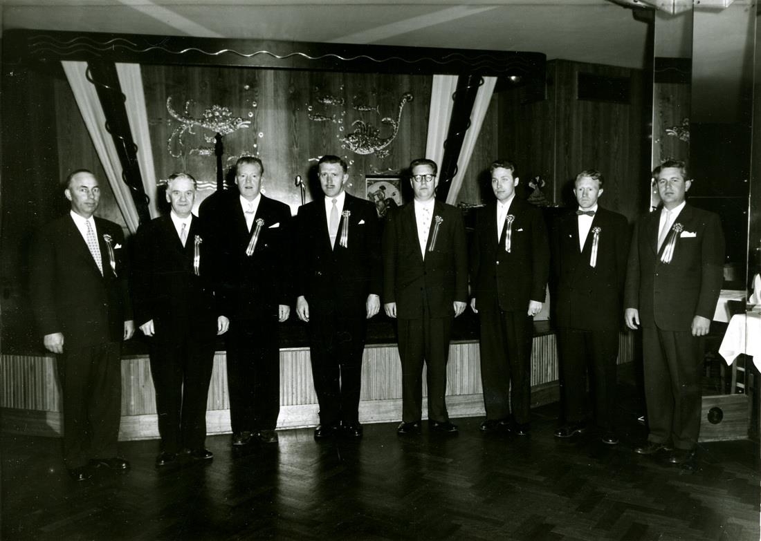 17. júní hátíðarhöldin 1953. Átta karlmenn með einhverskonar orðu á brjósti, talið f.v. Gísli Halldórsson forseti ÍSÍ, óþ., óþ., Þór Sandholt arkitekt og skólastjóri Iðnskólans í Reykjavík, Böðvar Pétursson bóksali, óþ., óþ., Eiríkur Guðbjartur Ásgeirsson forstjóri Strætisvagna Reykjavíkur yst t.h.