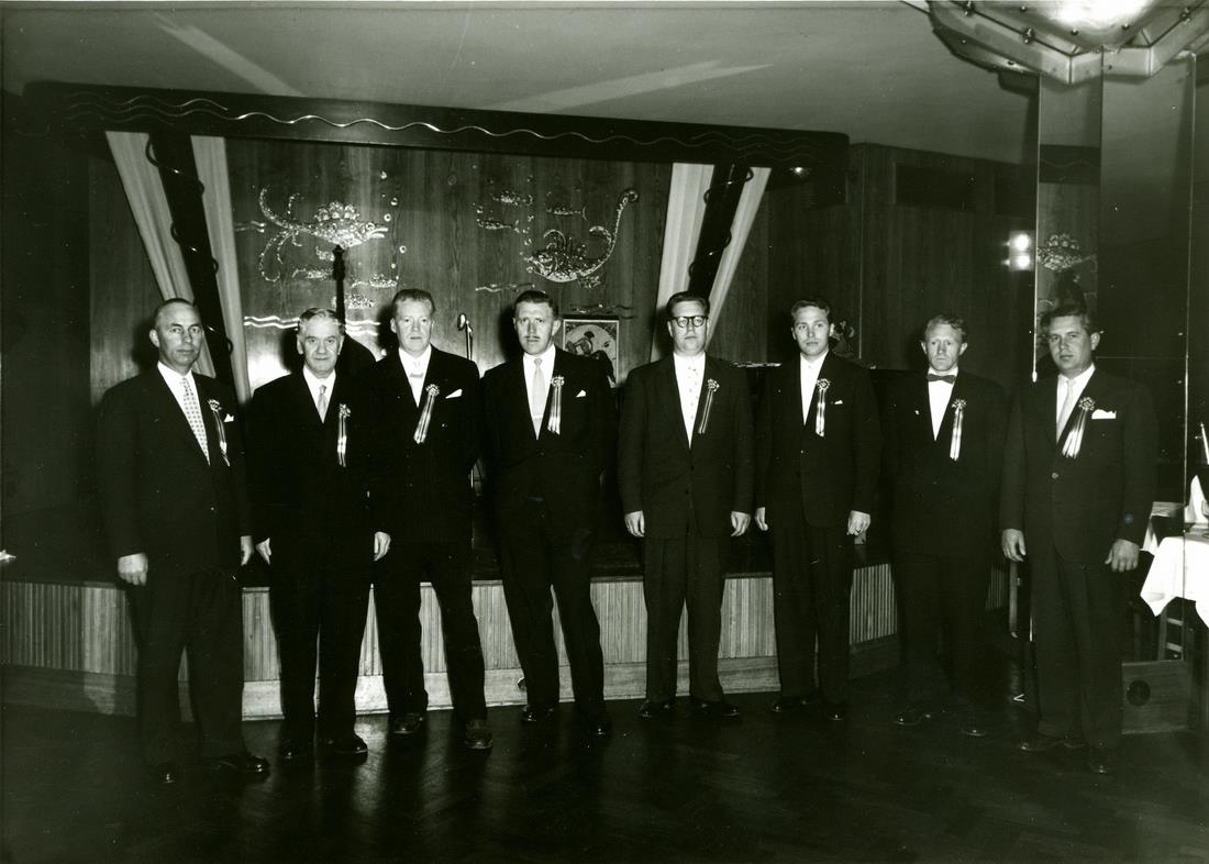 17. júní hátíðarhöldin 1953. Átta prúðbúnir karlmenn allir með orðu á brjósti, talið f.v. Gísli Halldórsson forseti ÍSÍ, óþ., óþ., Þór Sandholt arkitekt og skólastjóri Iðnskólans í Reykjavík, Böðvar Pétursson bóksali, óþ., óþ., Eiríkur Guðbjartur Ásgeirsson forstjóri Strætisvagna Reykjavíkur yst t.h.