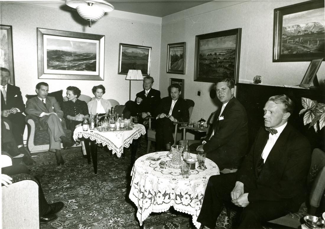 17. júní hátíðarhöldin 1953. Samkvæmi, líklega á þjóðhátíðardaginn, að öllum líkindum á heimili Þórs Sandholt að dæma eftir ljósmyndum á vegg. Prúðbúnir gestir sitja við vegg og borð á gólfi með úmsum drykkjarföngum. Málverk og ljósmynidr á veggjum. Ríkmannlegt heimili. Gestir sitja við vegg og eru borð á góli með drykkjarvörum.