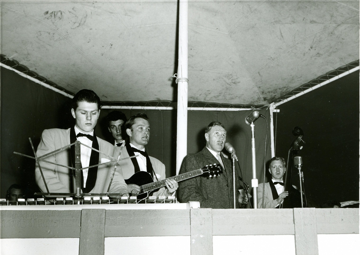17. júní hátíðarhöldin 1953. Hljómsveit Bjarna Böðvarssonar spilar fyrir dansi. F.v. Árni Scheving, Ragnar Bjarnason, Ólafur Gaukur Þórhallsson, Óþekktur söngvari, Jón Sigurðsson.