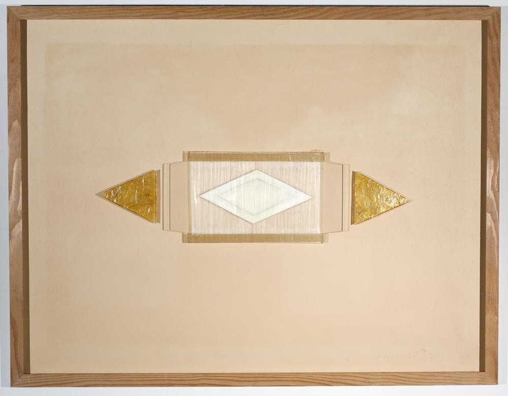 Ferningur úr gegnsæju plasti, límt saman við tvær plast lengur efst og neðst, með límbandi. Undir ferningnum er plastfilma og á milli þeirra er tígullaga pappírsbútur og á honum er blýantsteikning af tígli. Við báðar hliðar ferningsins eru þríhyrningar sem snúa úr, límband vafið utan um þá til að gefa áferð. Allar einingar festar á undirlag með skrúfum. Furu rammi.