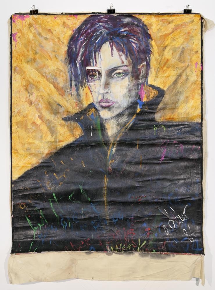 Akríl á lak. Myndefnið er portrettmynd af pönkaðri konu. Málað í mörgum umferðum - málning byrjuð að springa. Annað auga konunnar er skorið út að hluta - hangir frá striganum.