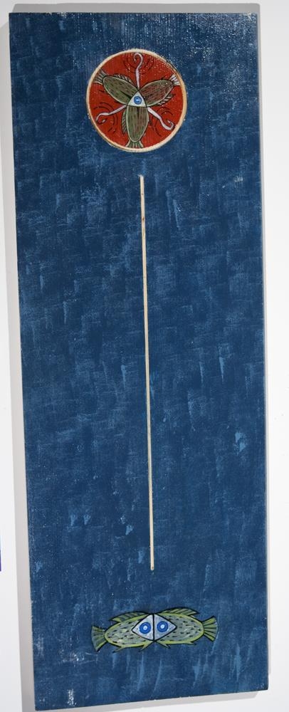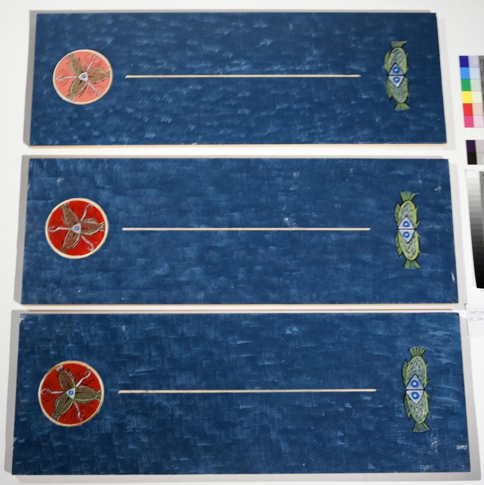 3 einingar - viðarplötur, allar málaðar með sambærilegu myndefni.Dökkblár grunnur- lína skorin í miðja plötu (40 cm löng)- Vinstramegin er rauður hringur, einnig skorið í kringum hann. Tákn inni í hringnum: myndað úr þremur fiskbúkum - sameinast með einn haus og 3 krókum. Rauði liturinn mis rauður eftir einingum.- Hægra megin eru 2 grænir fiskar sem sameinast með 1 haus.