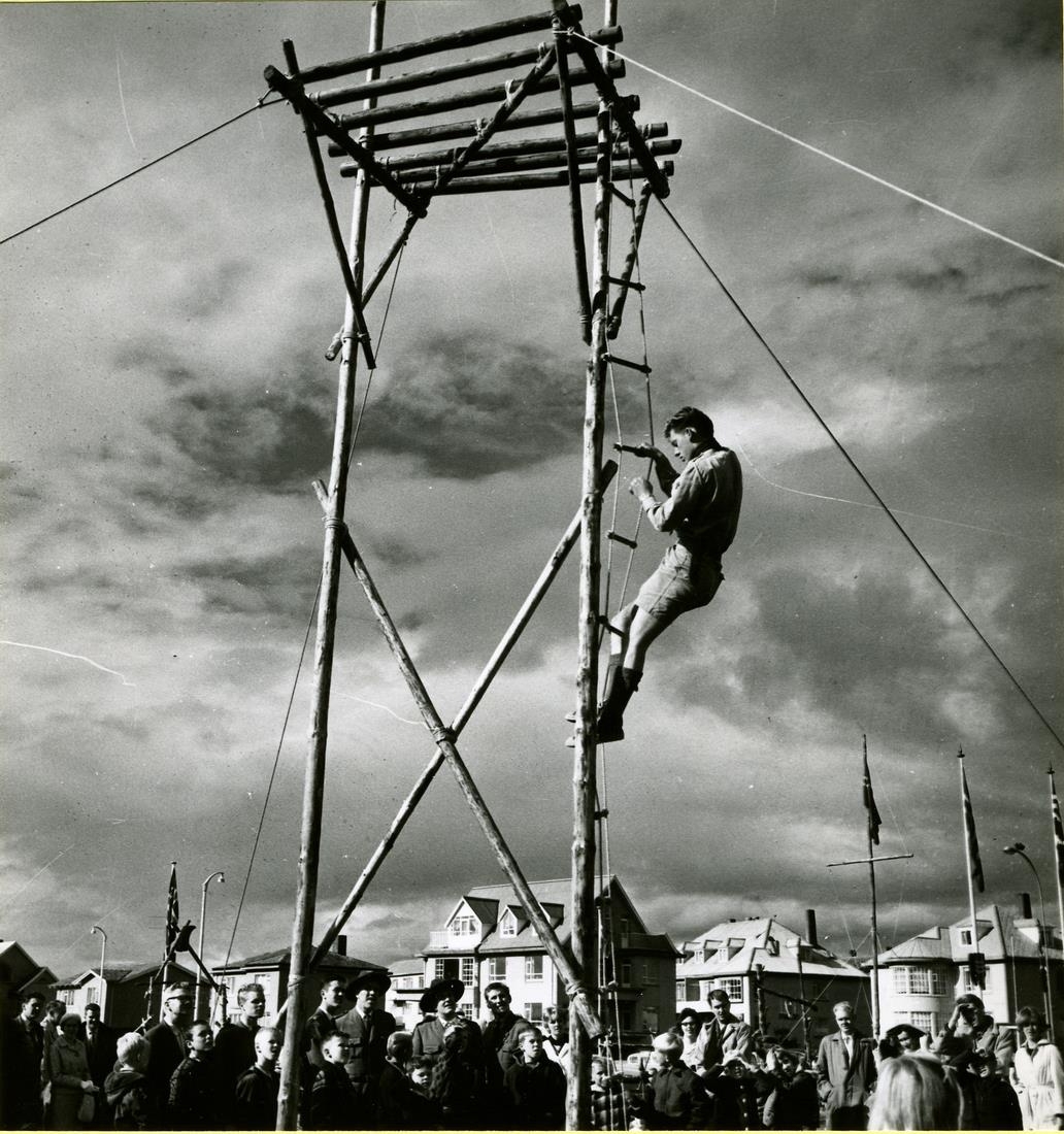 Skátamót á Hagatorgi. Karlmaður klifrar upp kaðalstiga í átt að palli sem er efst á háum og grönnum staurum. Áhorfendur fylgjast með, hús við Hagamel og Melhaga í bakgrunni.