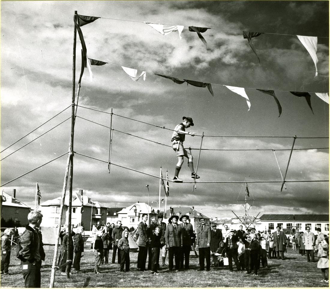 Skátamót á Hagatorgi. Skáti gengur eftir vírum milli staura. Áhorfendur fylgjast með, hús við Hagamel og Melhaga í bakgrunni
