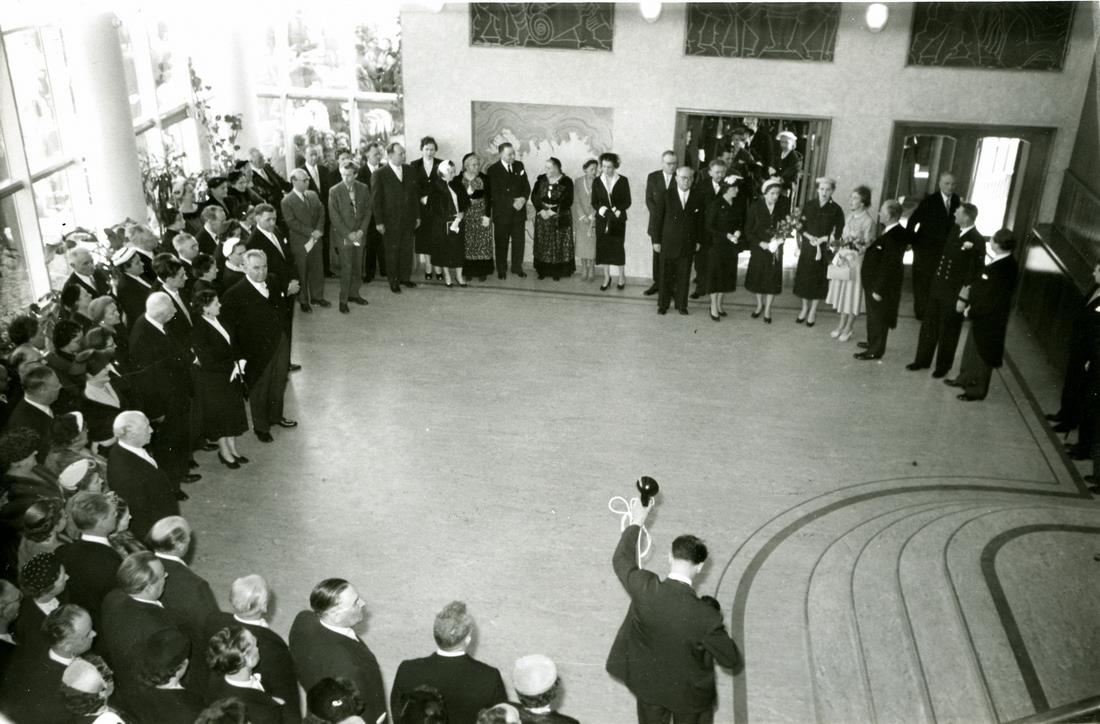 Frá heimsókn Friðriks IX. Danakonungs og Ingiríðar drottningar. Opinber móttaka í hátíðarsal Melaskólans.