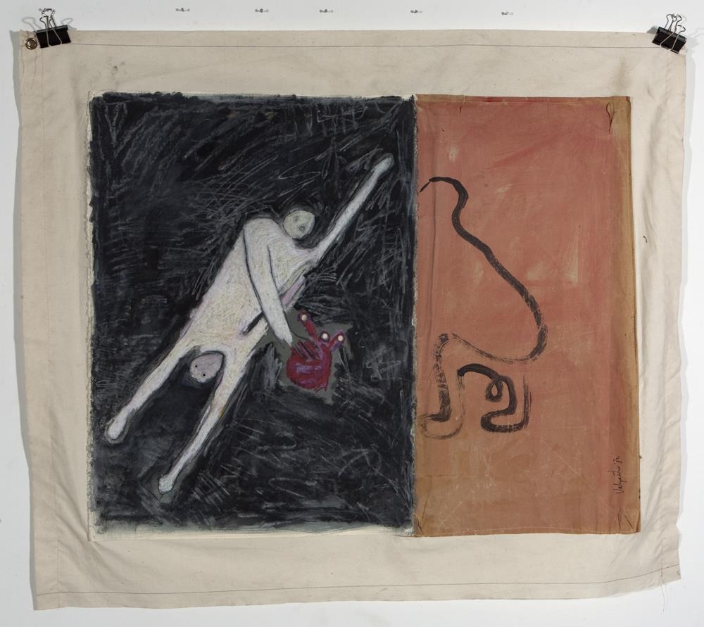 Akrílmálning á pappír sem er saumaður á bómullarefni. Tveir málmhringir í sitthvoru efra horninu. Tvær myndir eru á striganum, önnur er gerð á þunnan brúnan pappír, hin á þykkan hvítan pappír - saumaðar saman á brúnum. Á hvíta pappírnum er svartur bakgrunnur með hvítum óreglulegum strikum. Ljós fígúratíf vera, með tvö höfuð (eitt á hvorum enda), minnir annars á mannveru. Heldur á rauðu hjarta í annarri hönd. Tvö göt í augum verunnunar og 3 göt í hjartan - sést í undirlagið. Á brúna pappírnum eru svartar útlínur af mannveru á hlið - er í krjúpandi stellingu. Bakgrunnur bleikur