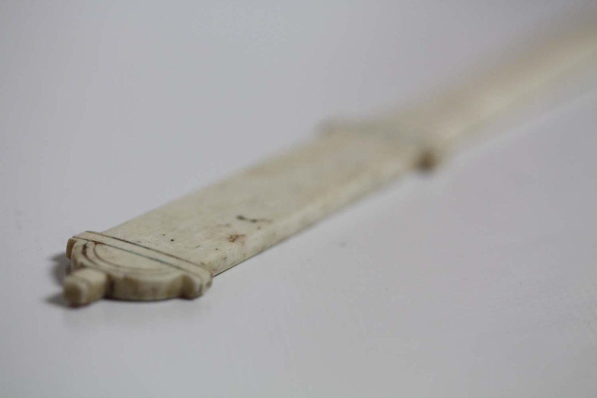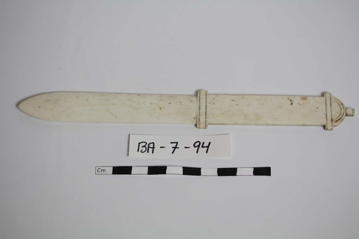 Bréfhnífur úr hvalbeini, smá skreytingar eru á honum, sjá meðfylgjandi myndir.
