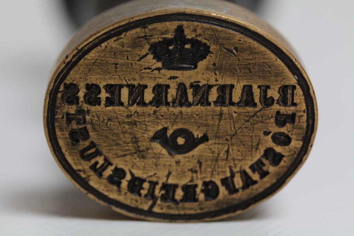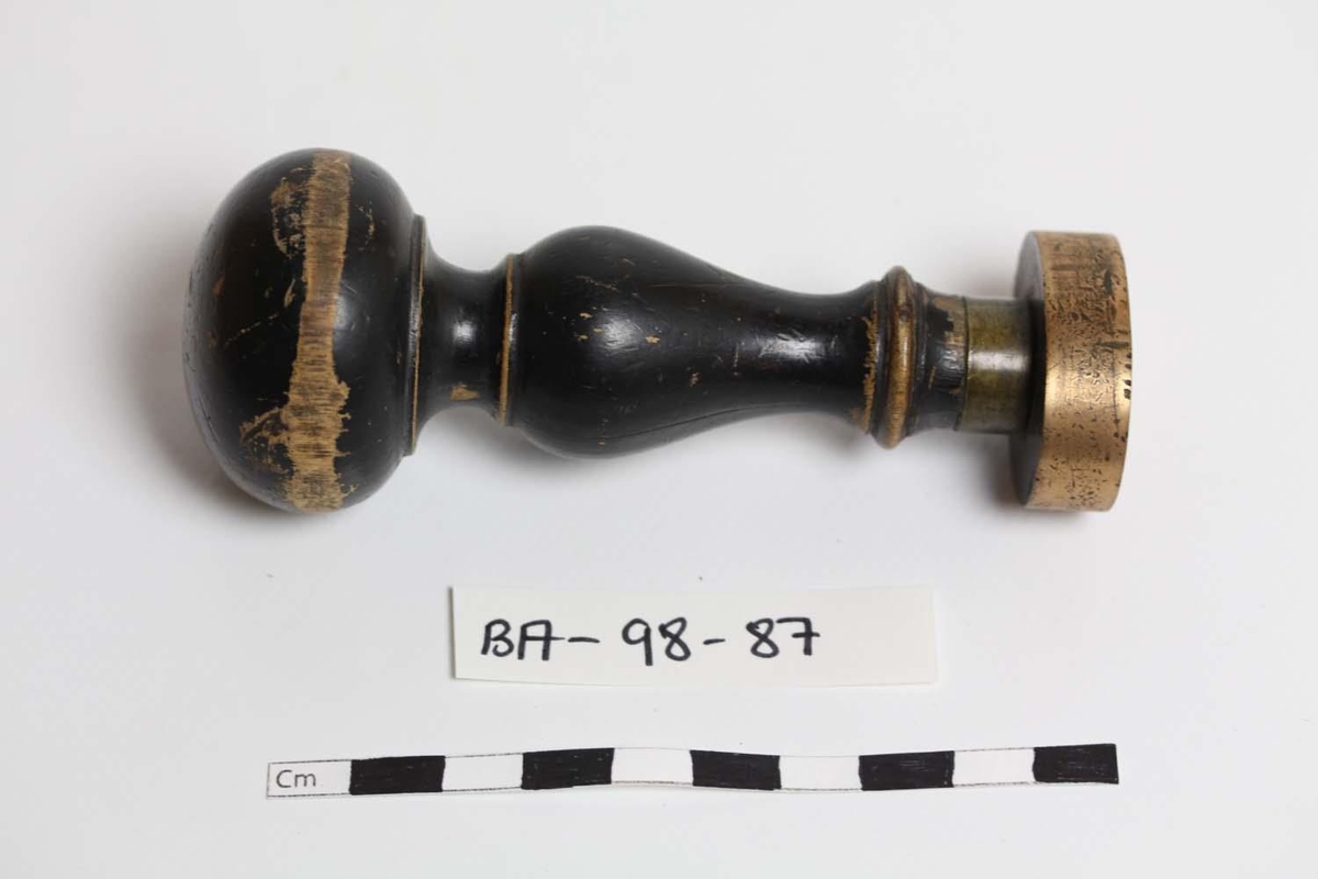 Viðarskaft, málað svart en farið að sjást mikið í viðinn. Stimpillinn sjálfur er CO/AU og áletrunin er: Bjarnaness Póstafgreiðslust og merkt pósts og síma(lúðurinn og kórónan).