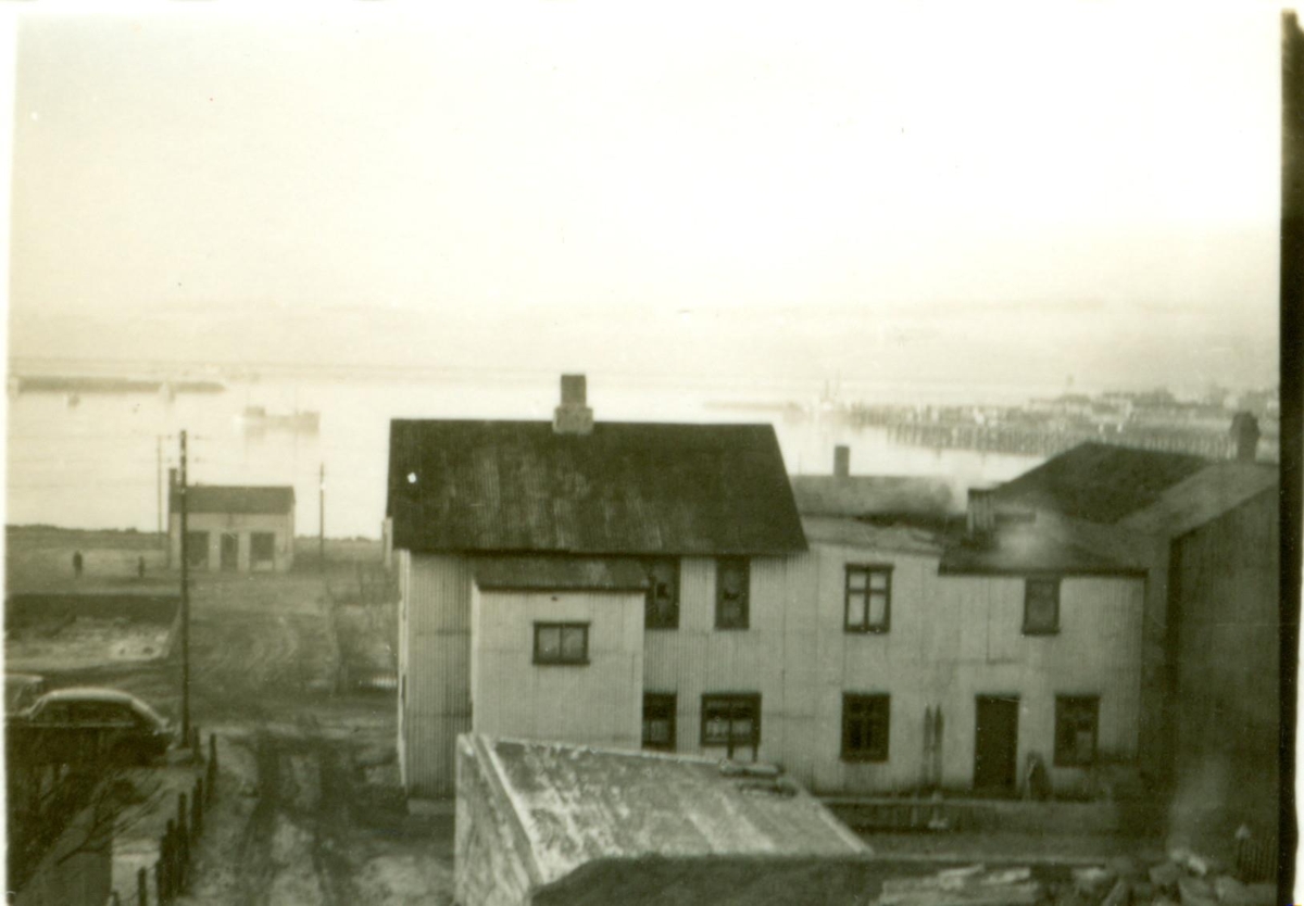 Mynd tekin af Brekkugötu niður að sjó, götustígurinn hét Brattagata. Húsið fremst á myndinni er hið svo kallaða Blöndalshús. Það er kennt við Th.S. Blöndahl, trésmið, kaupmannog síðar Alþingismann, en hann byggði húsið 1890. Í fjarksa nokkuð til vinstri er lítil bygging, verslunin Álfafell þar seldi Jóhann Petersen margvíslega vefnaðarvöru.
