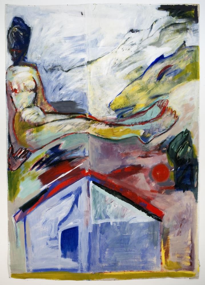 Málað á brúnan stífan pappa, efsta lagið er hvítt. Virðist vera akrílmálning, jafnvel vatnsþynntMyndefni: Mótar fyrir nakinni konu sem situr flötum beinum, með leggina beint fyrir framan sig - ekkert andlit, höfuðið er svart málað. Fyrir neðan konuna er form sem minnir á hús. Í bakgrunni eru útlínur fjalla. Breiðar og ákveðnar pensilstrokur.