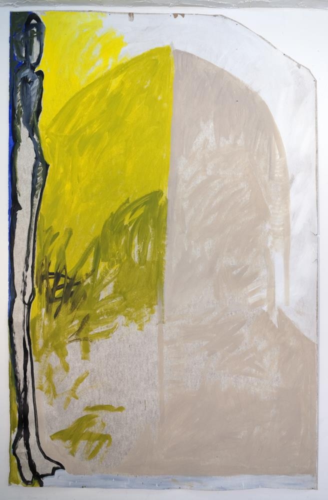 Akríl á brúnan, stífan pappa, efstalagið hvítt. Við vinstri brún verksins eru svartar útlínur afa mannslíkama á hlið - lóðréttur og nær yfir allan myndflötinn. Pappírinn er skorinn í boga efst, myndfletinum er skipt í tvennt, í gulan og ljósbleikan (húðlitur). Mannveran stendur við vinstri kannt, þar sem flöturinn er gulur. Bakgrunnur og myndflötur er ekki málaður að fullu - sést í pappírinn á nokkuð stóru svæði.