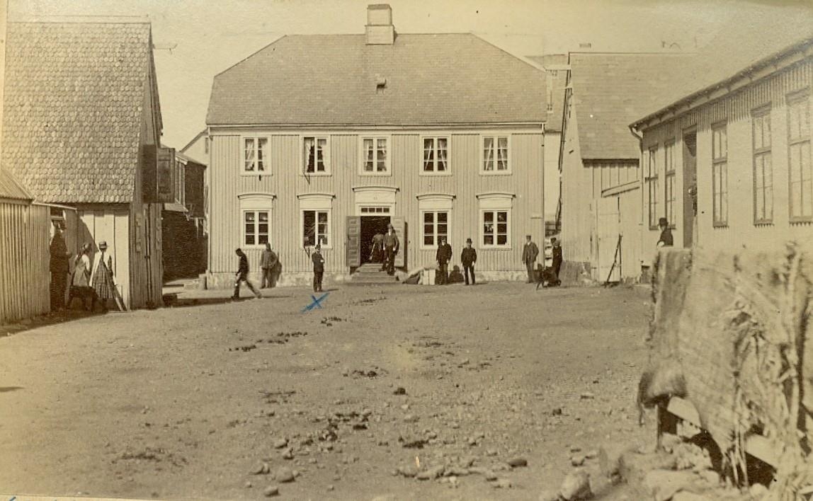 Horft eftir Hafnarstræti á Aðalstræti 2, Fishersverslun í Reykjavík. Fyrir framan húsið (merktur með x er Guðbrandur Finnbogason verslunarstjóri.