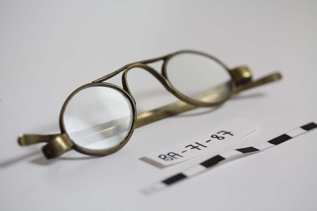 Gleraugun eru úr látúni. Krækjurnar eru orðnar dálítið bognar og ekki í samræmi við hvor aðra. Glerin eru rispuð.
