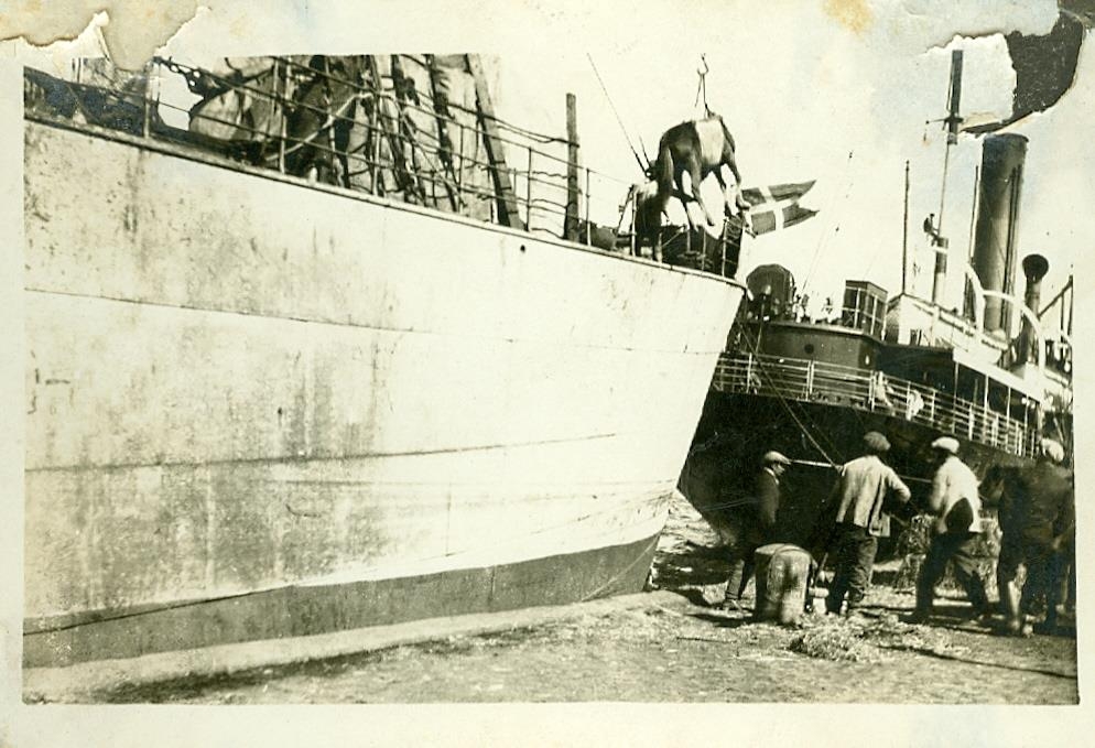 Hrossaútflutningur, hestur sést hífður upp í skip í Reykjavíkurhöfn.