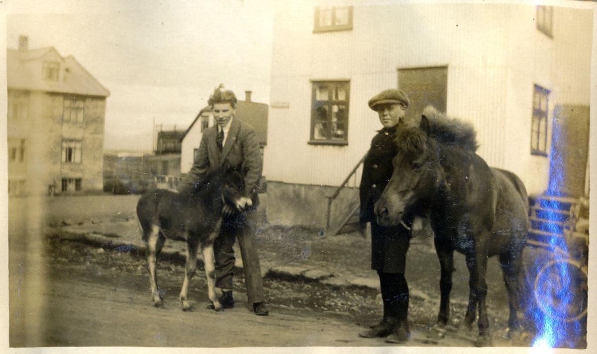 Tveir ungir karlmenn með hryssu og folald framan við tvílyft íbúðarhús, Laugavegur 92, Óskar Sveinbjörnsson t.v. Við myndina er skrifað: 1926. Við Laugaveg Rvk. Húsið sem var við hliðina á Stjörnubíói, kallað Barónshúsið.