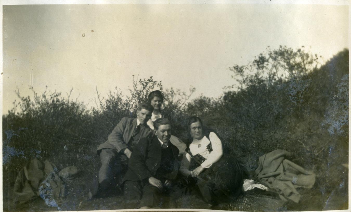 Tvö ung pör í lautar ferð, konurnar báðar í þjóðbúningi og karlmennirnir í jakkafötum. Við myndina er skrifað: 1925.