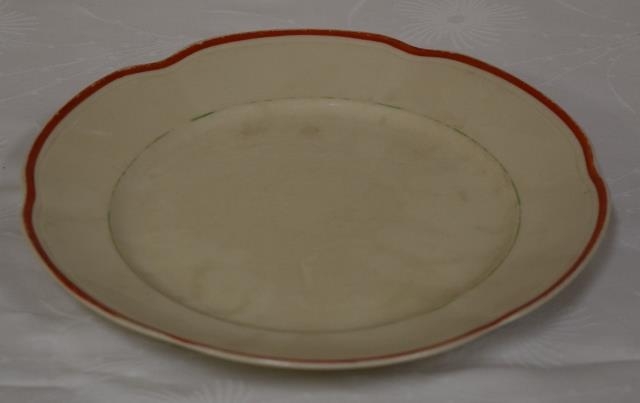 Grunnur diskurmeð rauðri rönd á barmi og mjórri grænni rönd 3,3 cm frá brún. Chodziez postulínsverksmiðjan í Póllandi.