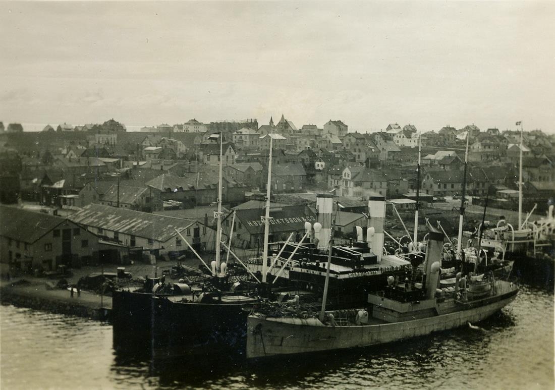 Í forgrunni er vestari hluti Reykjavíkurhafnar, tvö gufuknúin flutningaskipliggja samsíða kajann og togari þar utaná. Í baksýn sér yfir vesturhluta Kvosarinnar uppá Landakotshæðina í bakgrunni, þar er verið að byggja Landakotskirkju þá nýrri. Við myndina er skrifað: Rvík. 1926-27.