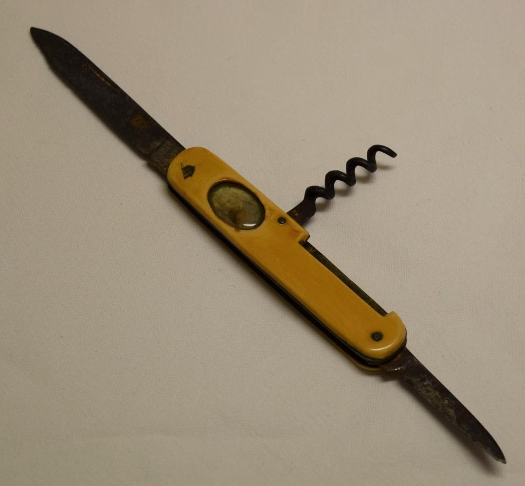 með mynd af manni undir gleri í skaftinu sem er gult.