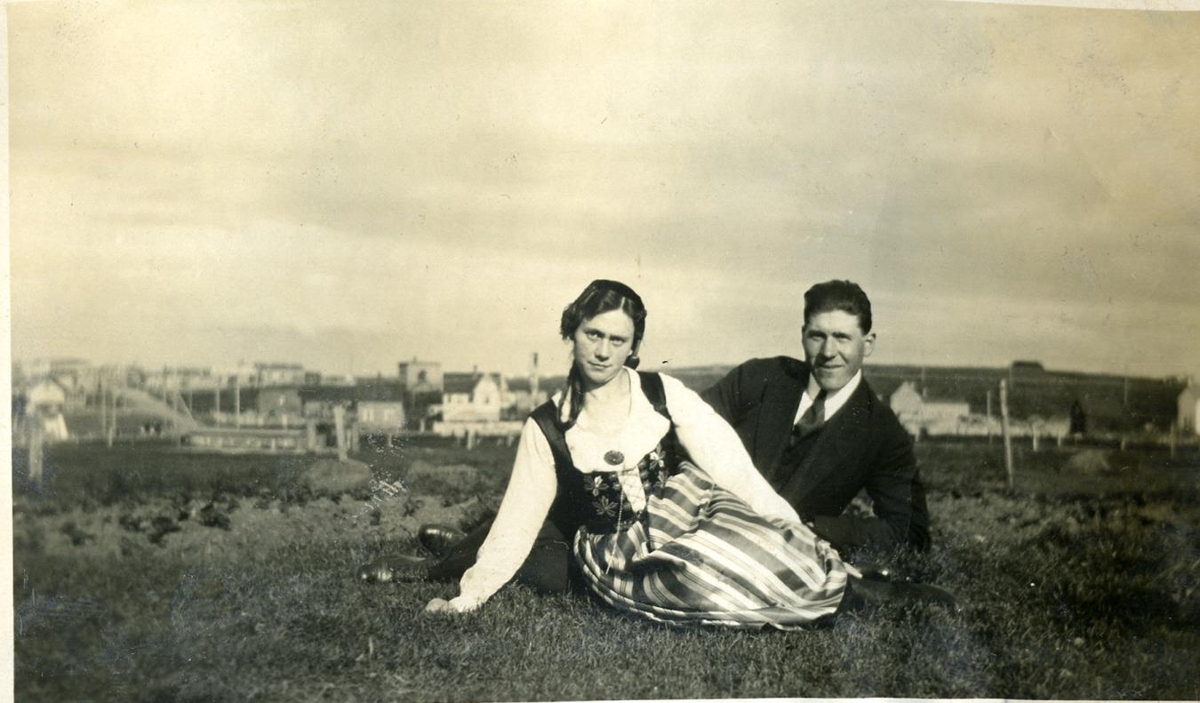 Elínborg á upphlut og Matthías í sparifötum á góðviðrisdegi.