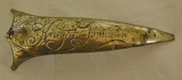 Nafnskjöldur af göngustaf Kristjáns Tómassonar (1844-1907) hreppstjóra á Þorbergsstöðum, Laxárdal, Dalasýslu.