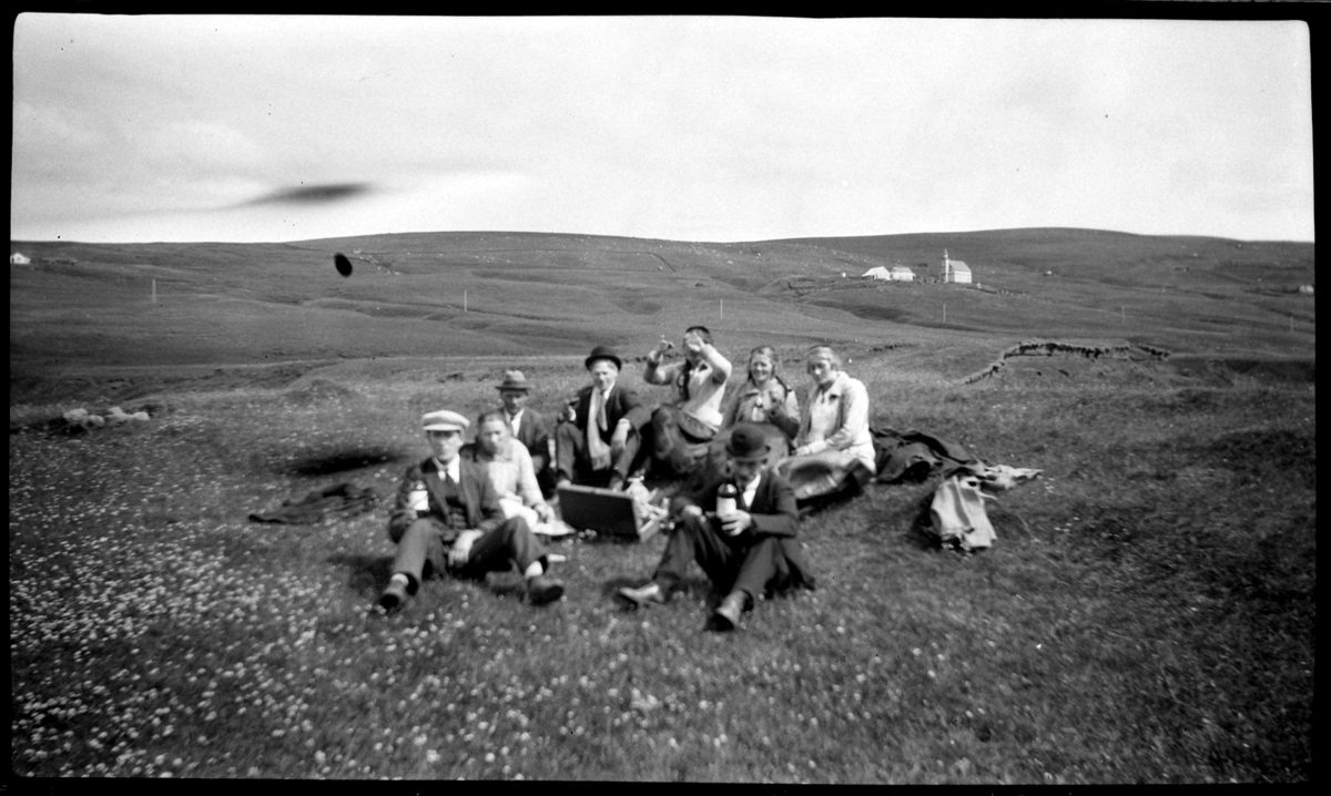 Hópur fólks situr með nesti í fösku á flatlendi, sér í rofabarð í baksýn og enn fjær uppí hlíð til kirkju og bæjar, Hlíðarenda í Fljótshlíð.