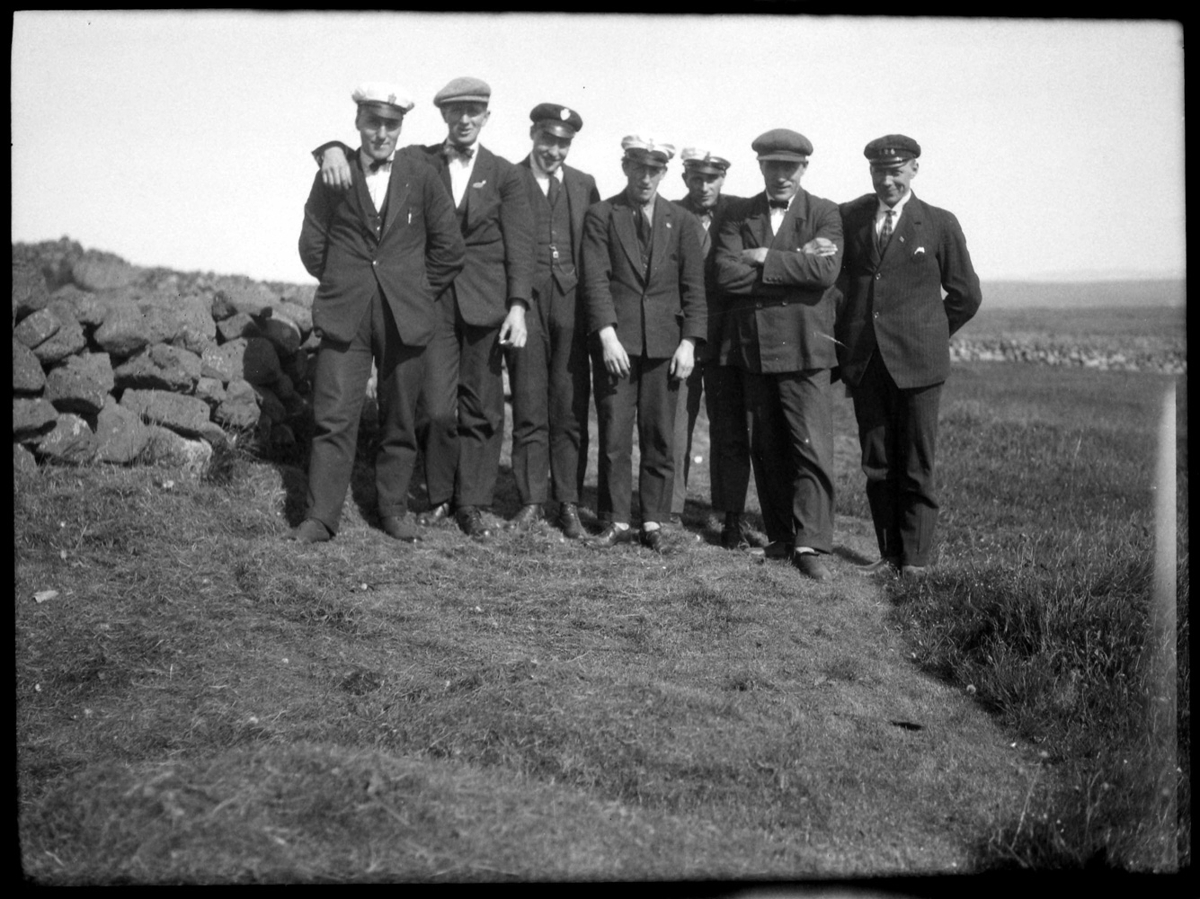 Hópur átta karla uppstilltur í röð á sleginni flöt við veggbrot. Þeir eru allir í jakkafötum með derhúfur.