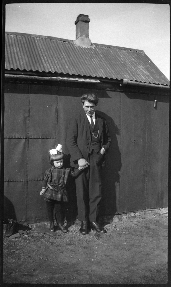 Maður í jakkafötum heldur í hönd á lítilli stúlku í kjól með slaufu í hári undir húsvegg.