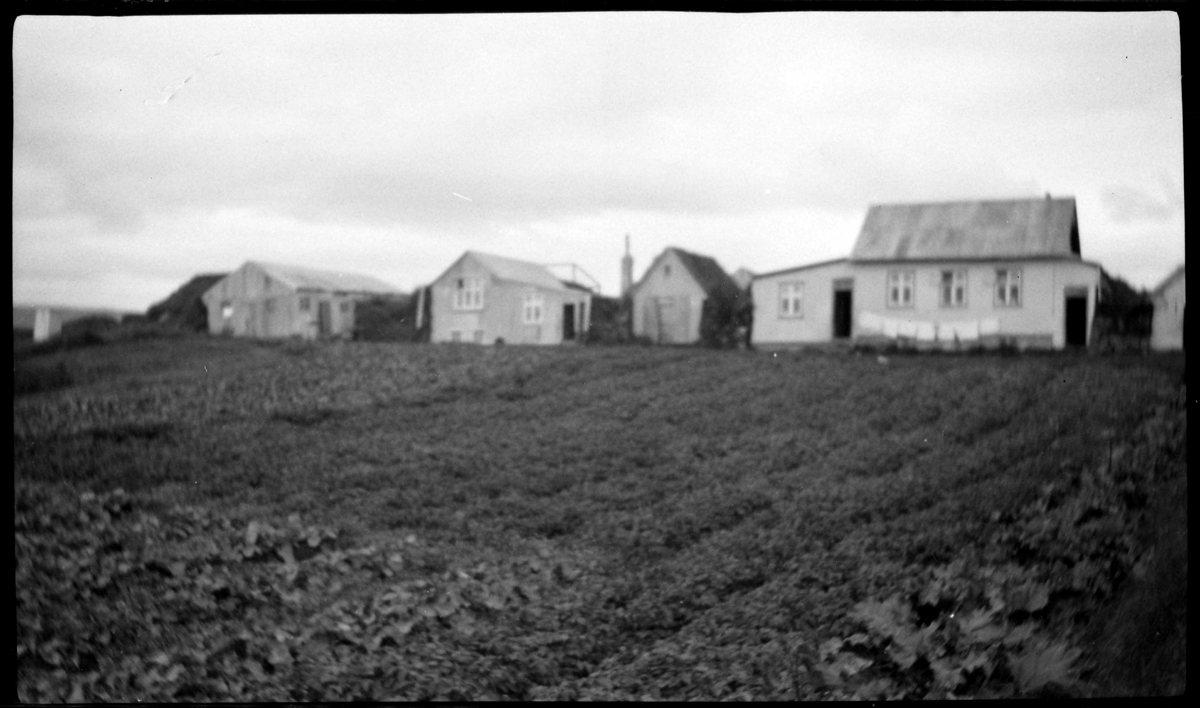 Bæjarröð með samblandi af torfhúsum og bárujárnsklæddum timburhúsum. Kartöflugarður framan við bæinn. Stakur kamar á jaðri myndar.