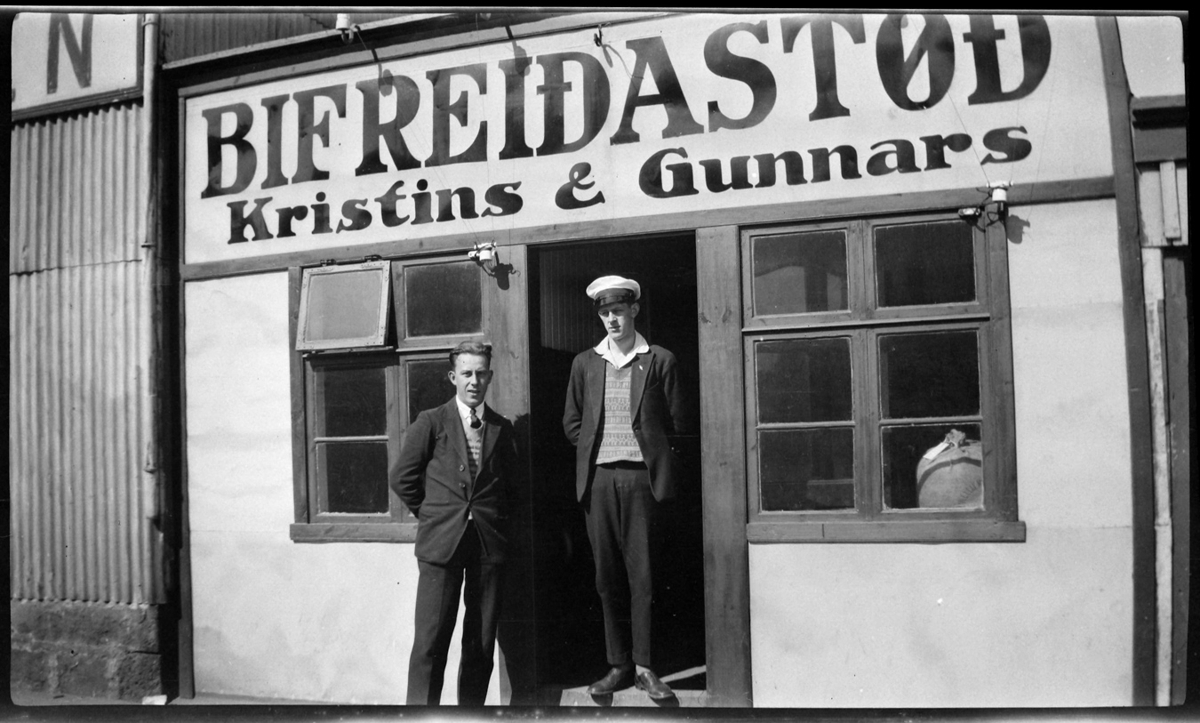 Tveir menn standa í dyragátt á skúr sem byggður er á milli húsa. Ofan við dyrnar er ámálað skilti BIFREIÐASTøÐ Kristins & Gunnars.