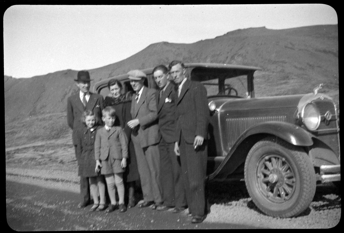Fólk við bíl á vegi. Talið vera Gestur Oddleifsson, Jónína Guðjónsdóttir frá Unnarholti, Reynir Snjólfsson maður hennar, óþekkt, óþekkt, Guðný Gestsdóttir og Sigurður Reynisson.