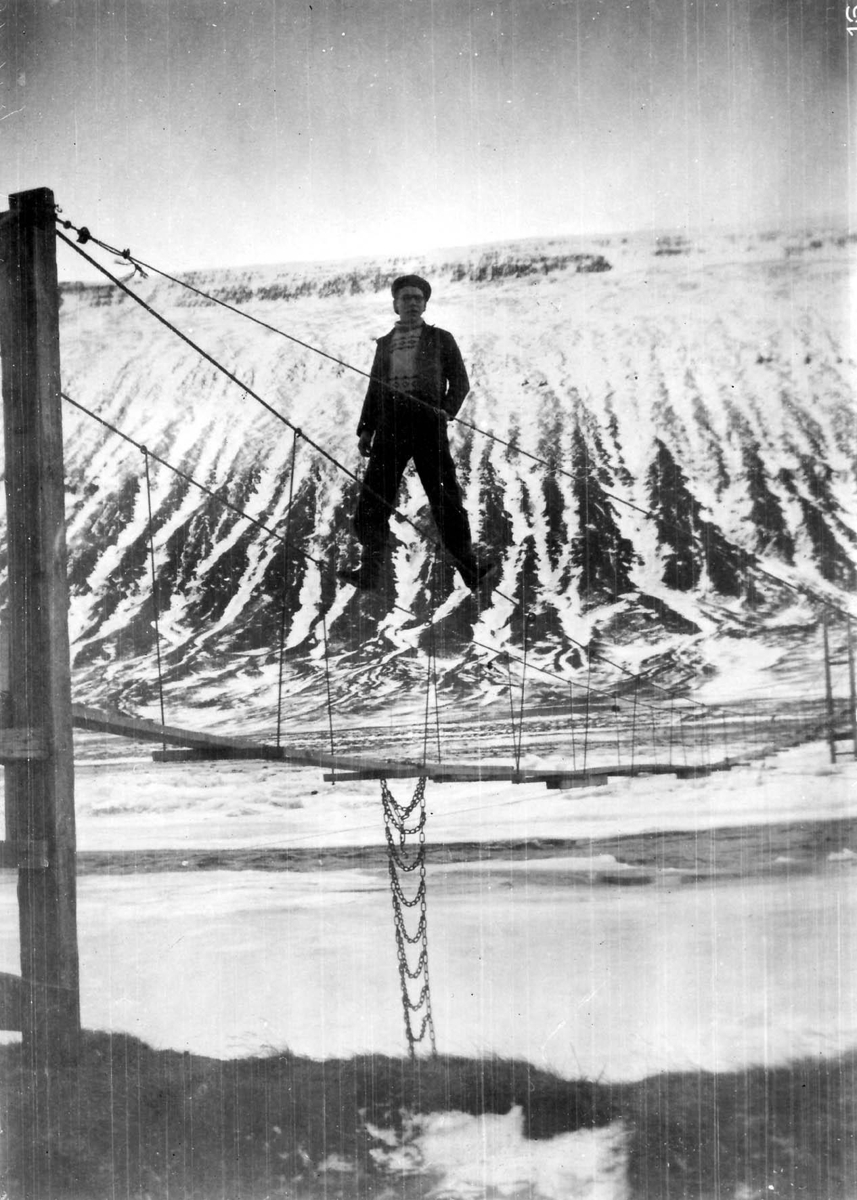 Kristján Óskarsson Hólakoti, síðar bóndi í Æsustaðagerði / Grænuhlíð á göngubrú yfir Eyjafjarðará við Hóla með Hólafjall í baksýn.