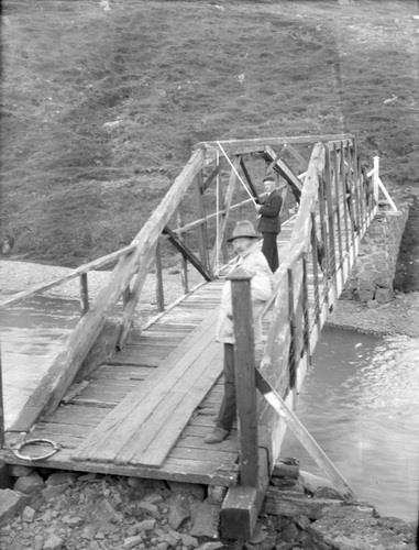 Brú yfir Svarfaðardalsá? Timburbrú. Tveir menn úti á brúnni. Annar þeirra sem stendur lengra úti á brúnni heldur í reipi sem liggur fram af brúnni. Í baksýn er hlíð.