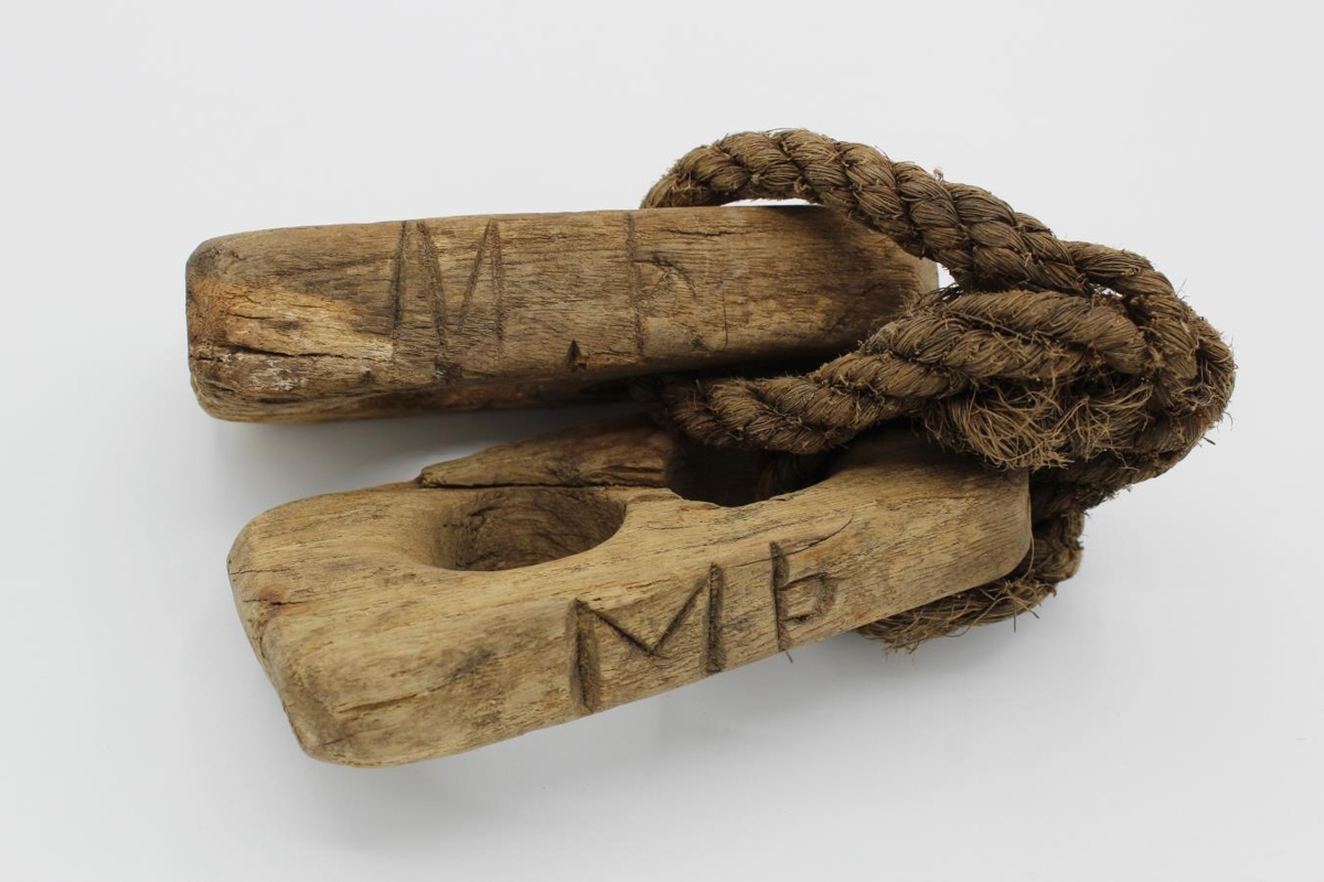 Tvær tréhagldir með síla. Lengd 10,5 sm, breidd 4,5 sm, hæð 2,5 sm.