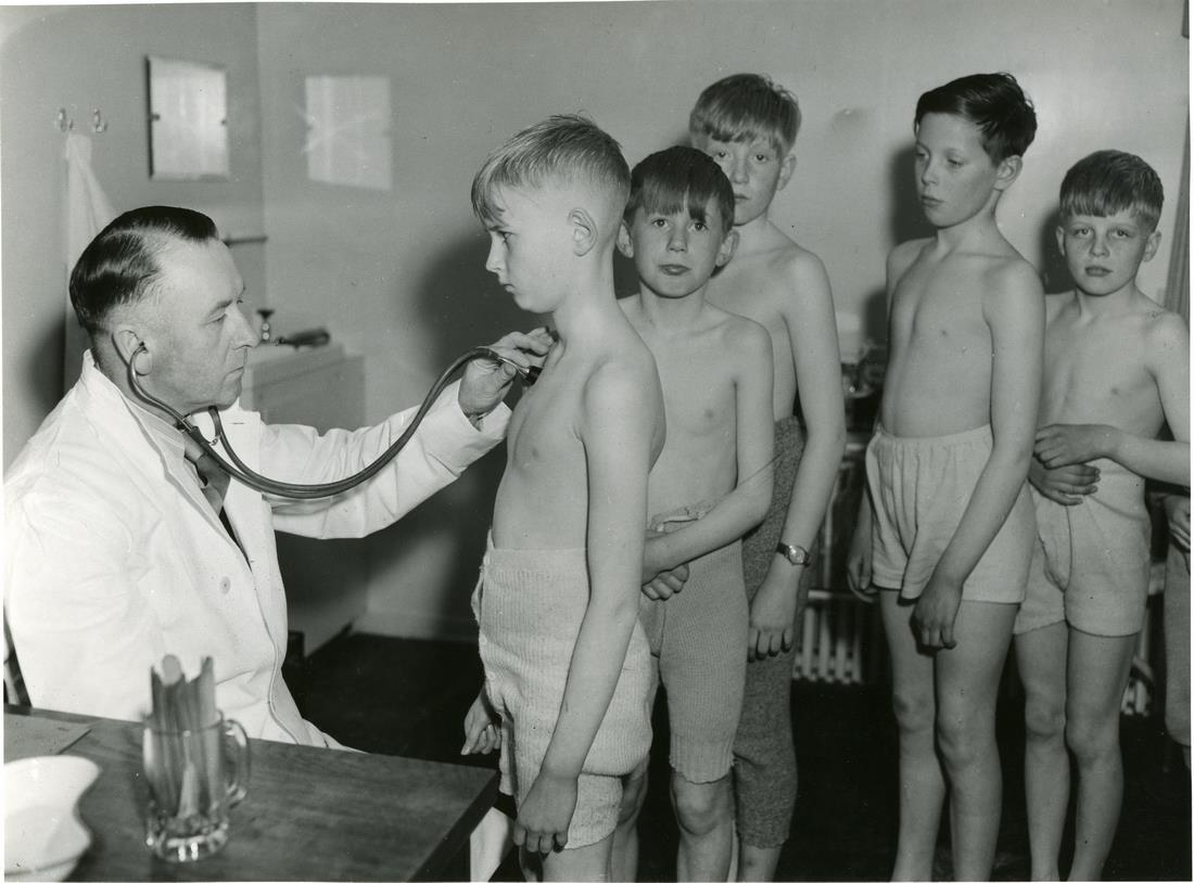 Læknisskoðun í barnaskóla. Nokkrir drengir bíða í röð eftir skoðun hjá lækni sem hlustar einn þeirra.