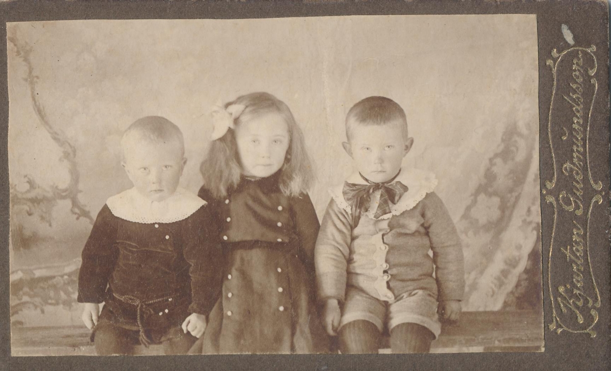 Ljósmynd úr fórum Stefáns S. Stefánssonar sem kenndur er við Hlið á Eyrarbakka. Upphaflegur eigandi myndanna var Ingvar Halldórsson í Hliði. Á myndinni eru systkinin í Akri á Eyrarbakka. Sveinn, Bjarni og Guðfinna Árnabörn.
