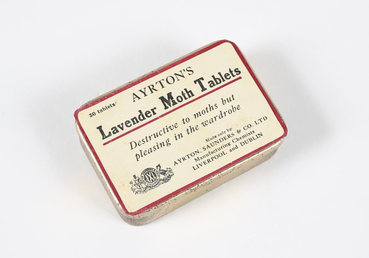Box undan þvottabláma með hvítum miða á loki: Lavender moth tablets.