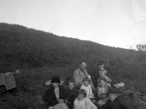 Fólk í lautarferð. Efst í hópnum eru hjónin GZ og Hólmfríður Geirsdóttir, með Gunnar Zoëga í fanginu. Miðröð frá vinstri: 1) „Tóta“ Þórvör Guðjónsdóttir (var á heimilinu í áratugi) 2) Geir Agnar 3) Helga Zoëga 4) Ída Fenger. Neðstra röðin frá vinstri: 5) Bryndís Zoëga, 6) drengur líklega Hilmar Fenger.