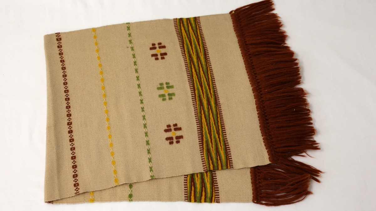 Borðrenningur úr íslensku ullargarni ofinn með skuggavefnaði. Litur ljósbeis í grunninn, kögur rauðbrúnt og munstur rauðbrúnt, gult og grænt. Var unninn á Tóvinnuskólanum Svalbarði við Eyjafjörð veturinn 1955 - 56.