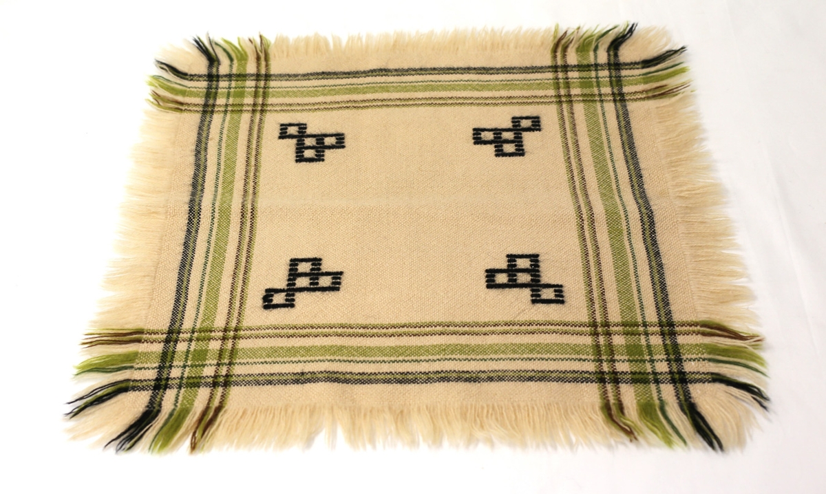 Handofinn dúkur sem er ferkantaður. Vefnaðurinn er einskefta og glitvefnaður. Kögur er 5 cm allan hringinn. Dúkurinn er úr ljósdrapplitu ullarbandi og munstrið er svart, dökkgrænt og dökkbrúnt. Var unninn á Tóvinnuskólanum Svalbarði við Eyjafjörð veturinn 1955 - 56.